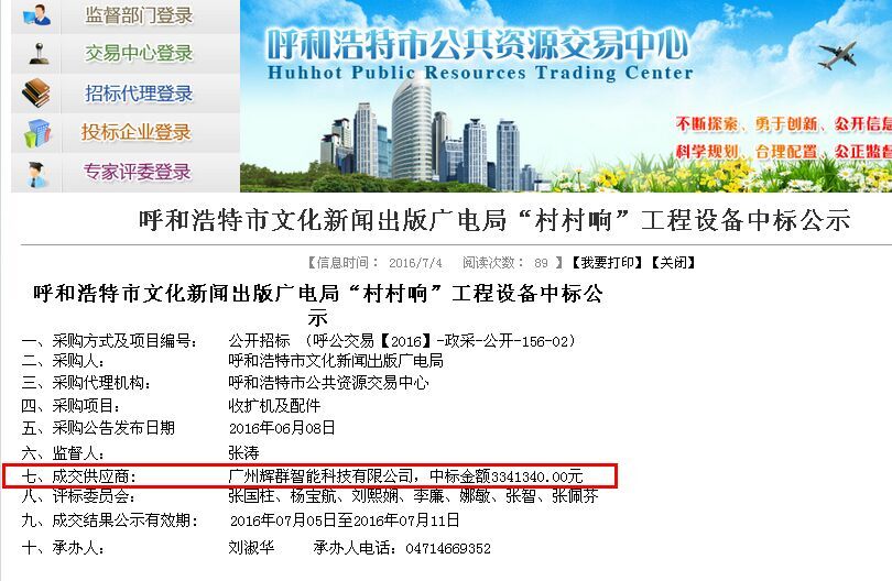 热烈祝贺乐竞官方网站在呼和浩特市文化新闻出版广电局发布的“呼和浩特市文化新闻出版广电局“村村响”工程设备, 项目编号:呼公交易【2016】-政采-公开-156-02”进行项目公开招标的投标活动,顺利中标。! 我公司非常荣幸成为该项目中标厂家,我们在此郑重承诺,将以高度的责任感,严格按照投标文件承诺,按期高质量完成。